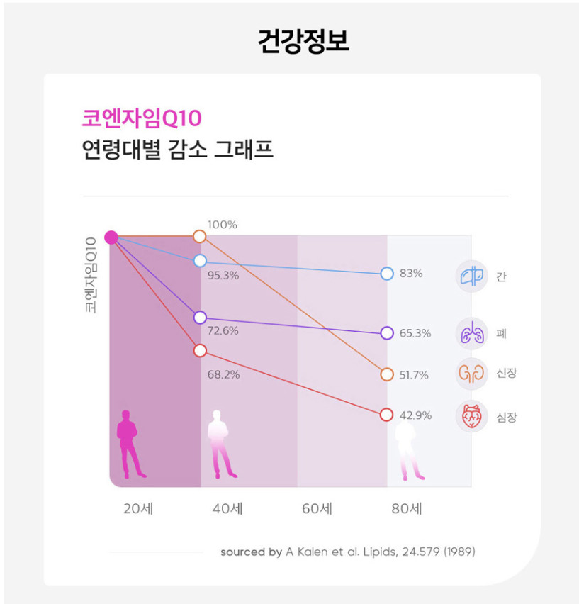 우리 몸속 세포 안에 살고 있는 보조 효소 중 하나로 주로 심장과 신장, 간에 존재하고 있습니다. 하지만 나이가 들어감에 따라 자연 감소되고 있지만 음식으로는 섭취가 어려울 경우 별도 영양제를 섭취가 필요합니다.