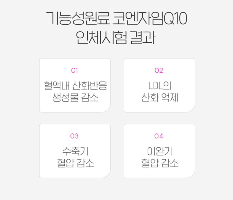 기능성원료 코엔자임 Q10 인체시험 결과 혈압이 정상보다 높은 성인에게 코엔자임 Q10를 보충시킨 결과 섭취 후 수축기 혈압과 이완기 혈압이 유의적으로 감소되었다는 연구 결과가 있어 식약처에서 기능성 원료로 인정을 받았습니다.